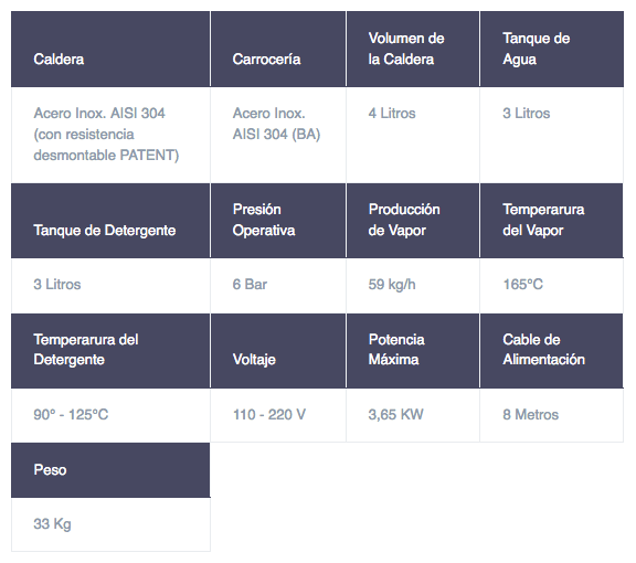 Generador de vapor, con recarga automática, con sensor de nivel electromagnético al interior de la caldera – True Temp, carrocería de acero barnizado, con aspiradora de solidos y liquidos, tanque de aspiración en plastico, dotado de un flotador de 1,2KW. Inyección de detergente. Opcional: inyección de agua caliente.