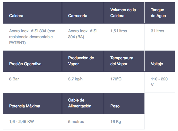 Generador de vapor, con carrocería de acero inoxidable, recarga automática, con sensor de nivel electromagnético al interior de la caldera –True Temp. Instrumento digital con función de: termómetro, manómetro, cuenta horas, aviso “CALC” para limpieza caldera. Inyección de agua calentada estándar.