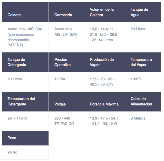 Generador de vapor trifásico, con recarga automática, carrocería de acero inox con impermeabilidad IPX5, inyección de detergente, Inyección de agua calentada estándar y conexión directa a la red hídrica. Presión operativa de 10 Bar. Con aspiradora de tipo industrial de 3KW capaz de aspirar solidos y liquidos. Se tienen las dos funciones: Vapor y aspiración